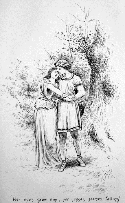“Not yet,” she whispered with a noble effort that steadied voice and lips, and kept down mortal agony; “not yet; for I know too well I am stricken to the death. While the steel is there it serves to stanch the life-blood. When I draw it out, then scatter a handful of dust over my forehead, and lay the death-penny on my tongue. I would fain last a few moments longer, Esca, were it but to look on thy dear face! Raise me, both of you. I have somewhat to say, and my time is short.”