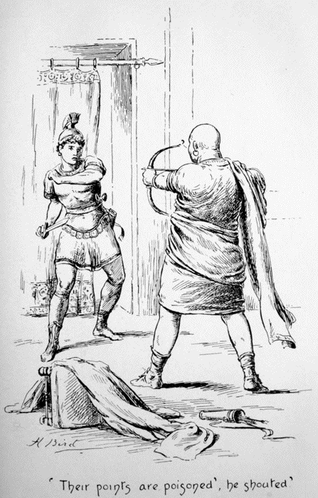 “Go to the rear,” said he, “and take the lass with thee, man, since she seems to hang like a clog round thy neck, wherever there is fighting to be done. Give yourselves up to the Tenth Legion, and tell Licinius, who commands it, you are my prisoners. ’Tis your only chance of safety, my pretty damsel, and none of your sex ever yet had cause to rue her trust in Hippias. You may tell him also, Esca, that if he make not the more haste, I shall have taken the Temple, and all belonging to it, without his help. Off with thee, lad! this is no place for a woman. Get her out of it as quick as thou canst.”