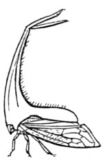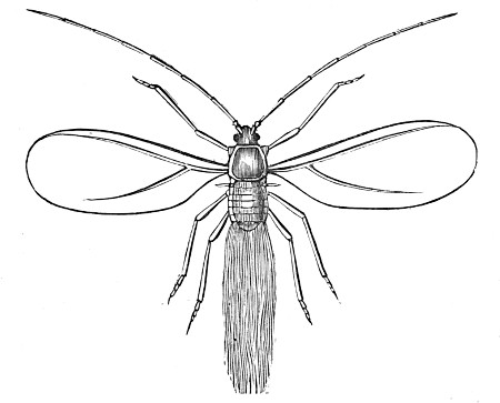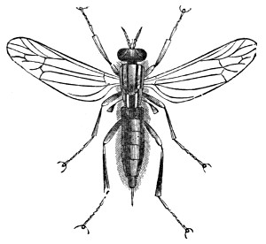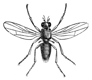 The Ortalinæ are flies of small or moderate size, which are met with principally in woods and fields. The Trypetinæ feed chiefly on fruit. One species, Ceratitis hispanica, is very destructive to oranges in the south of Europe, etc. Of the Piophilinæ, Piophila casei may be taken as the typical example. The larvæ which[106] abound in cheese and bacon are popularly called "Cheese Hoppers," or "Jumpers," in allusion to their habit of springing. The Diopsinæ are principally met with in the tropical parts of the world. They are generally insects of moderate size. Most of the species of Chloropinæ are of small size. Their larvæ generally live in the stems of corn and various kinds of grasses. The Drosophilinæ are small, dull-coloured flies, the larvæ of which feed on fungi, rotten fruit, and similar substances.