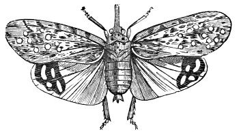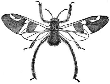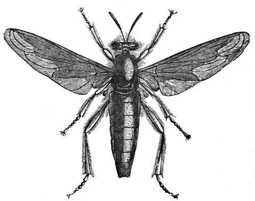 Family 10, Sphegidæ.—Most of the insects included in this family feed upon grasshoppers, and the manner in which they procure their prey is very curious. In attacking their bulky prey[23] they use every endeavour to turn the grasshopper on its back. When they succeed in this they inflict stings in different parts of the underside of the abdomen and thorax, which soon paralyse the victim, which is then dragged to the nest of the ruthless destroyer.