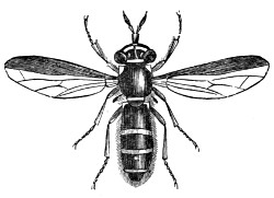 Family 6, Philanthidæ.—Most of the species belonging to this family are black with yellow spots and bands, and most of them are inhabitants of the warmer parts of the earth. Some of the species provision their nests with beetles and grasshoppers, while[22] others attack bees, and are very mischievous, destroying great numbers.