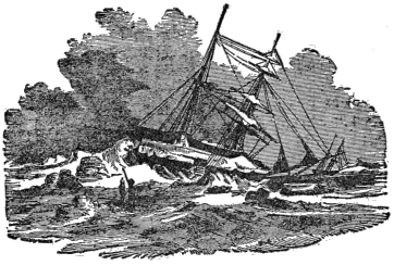 “When I reached the deck, we were nearly up to her, for we had shaken out our reefs, and were driving before the wind, shipping seas at every roll. The little schooner was under a single close-reefed top-sail, « 28 » and seemed fluttering over the waves like a crippled bird. Presently an old fellow, with a cloak tossed over his night gear, appeared in the lee gangway, and saluted with a voice that rose above the winds.
