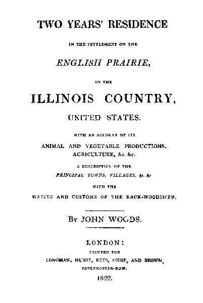 | Two Years' Residence in the Settlement on the English Prairie, in the Illinois Country, United States [June 5, 1820-July 3, 1821]. With an Account of its Animal and Vegetable Productions, Agriculture, &c. &c. A Description of the Principal Towns, Villages, &c. &c. With the Habits and Customs of the Back-Woodsmen. John Woods | |