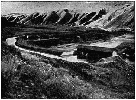 The copper cables were so strung as to have a minimum distance from the ground of 25 feet at the lowest points of the spans. In order to do this the standard steel towers that hold the lower cables 40 feet above the ground level at the insulators are spaced at varying distances apart, according to the nature of the ground between them. At each tower the upper cable of each circuit is 5 feet 3 inches higher than the two lower cables, and this distance between the elevations of the upper and the lower cables is maintained whatever the[325] amount of sag at the centre of each span. If there is a depression between two standard towers on a straight portion of the line, the sag in the centre of a span 400 feet long may be as much as 18 feet. Where a rise and fall in the ground between towers make it necessary to limit the sag to 14 feet in order to keep the lowest cables 25 feet above the highest point of earth, the length of span is limited to 350 feet. If the rise and fall of ground level between towers allow a sag of only 11 feet with the lowest cable 25 feet above the earth, the length of span with 40-foot towers is reduced to 300 feet; and if for a like reason the sag is limited to 8 feet, the span may only be 250 feet.