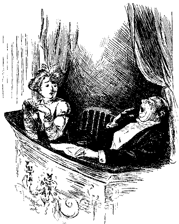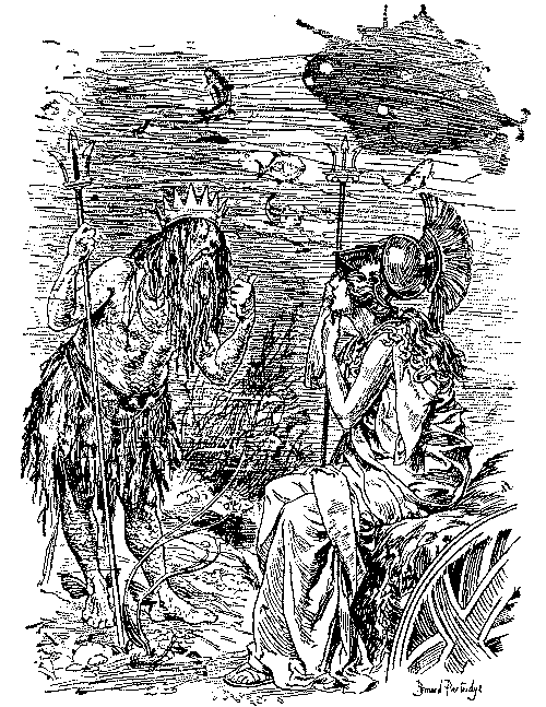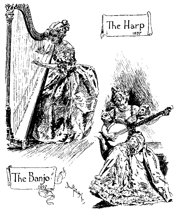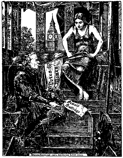 To turn from outlines to details, one is confronted in 1893 with Mr. Gladstone's second attempt to solve a problem which Giraldus Cambrensis pronounced insoluble seven centuries ago. Punch's earlier cartoons on the Home Rule Bill are negligible, but the difficulties of the Premier's position are aptly shown in the picture of Gladstone as a knight in armour on a perilous pathway between the Irish Nationalist bog and the "last ditch" of Ulster. The accompanying text, modelled on Bunyan, represents Mr. Gladstone as a Pilgrim relying as much on tactics as the sword. The most genial reference to Ulster is that in which she figures as the Widow Wadman asking Uncle Toby, "Now, Mr. Bull, do you see any 'green' in my eye?" and Uncle Toby protests he "can see nothing whatever of the sort." Otherwise Punch's attitude is unsympathetic, witness the use of the term "Ulsteria" and the epigram on the second reading of the Bill, put, it is true, into the mouth of "A rebellious Rad":—