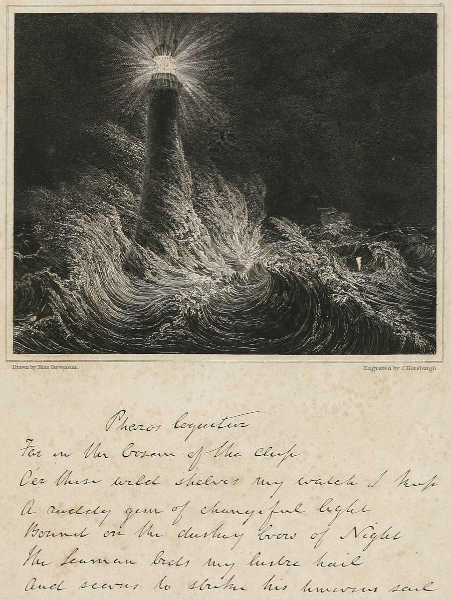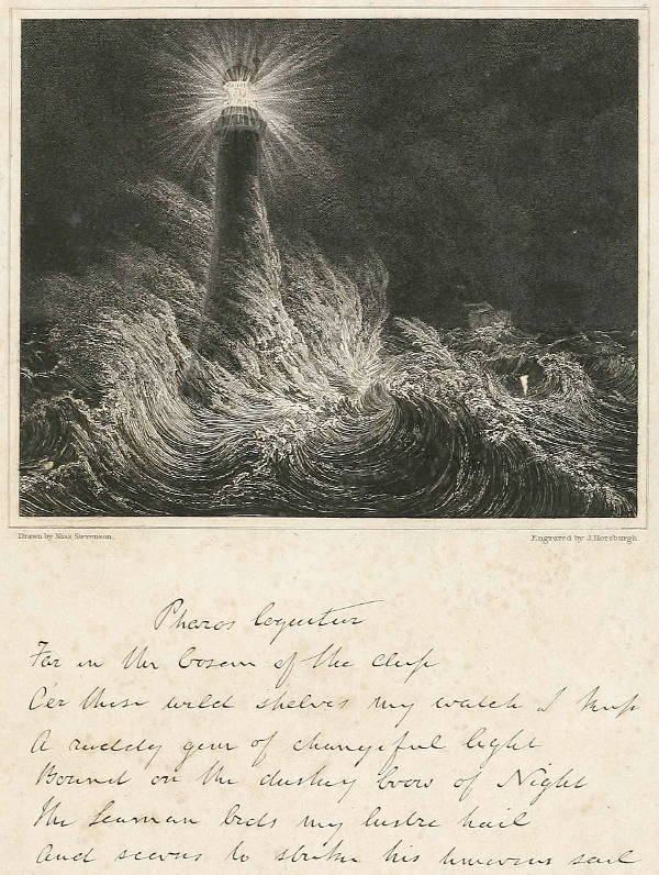 The night scene of the Bell Rock Light-house, in the Vignette of the Second Title-page, was drawn by Miss Stevenson, from a sketch by the masterly hand of Mr Skene of Rubislaw. To Miss Stevenson, also, as an amanuensis, the writer takes this opportunity, with parental affection, of acknowledging his obligation for almost the entire manuscript written to his diction. The reader will be gratified to find, in connection with this Vignette, inserted at page 64., a fac-simile of the handwriting of Sir Walter Scott, Bart. in the expressive and beautiful lines which he wrote in the Album kept at the Light-house, as noticed at page 419.
