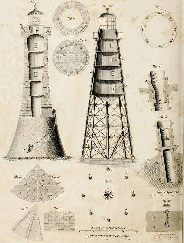 In the range of aquatic buildings applicable to the purposes of a Light-house, which the writer has examined, he was forcibly struck with the magnitude of the Tour de Corduan, on the French coast. This magnificent edifice measures about 145 feet in diameter at the base, and 150 feet in height. Its cubical contents may perhaps be stated at the immense quantity of 339,432 feet; of which the basement alone forms about 200,000 feet. This building has undergone considerable alterations since its completion in the year 1609, as appears from Belidor’s Architecture Hydraulique, tom. ii. At the time of its alteration from a coal fire to an oil light with reflectors, the upper parts in particular seem to have been greatly simplified, by the removal of several of its exterior ornamental appendages.
