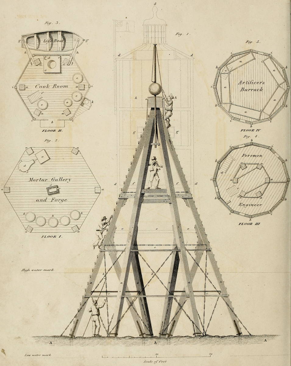 | [x]The Smeaton arrives at the Rock, 18th September, with the Beams of the Beacon-house. Preparations made, and four of the principal ones erected. Method of raising them, and fixing the great Iron-Stanchions. Seven hours’ work upon the Rock in one ebb-tide. The remaining two principal, and four of the supporting beams, erected. | 166–171 |