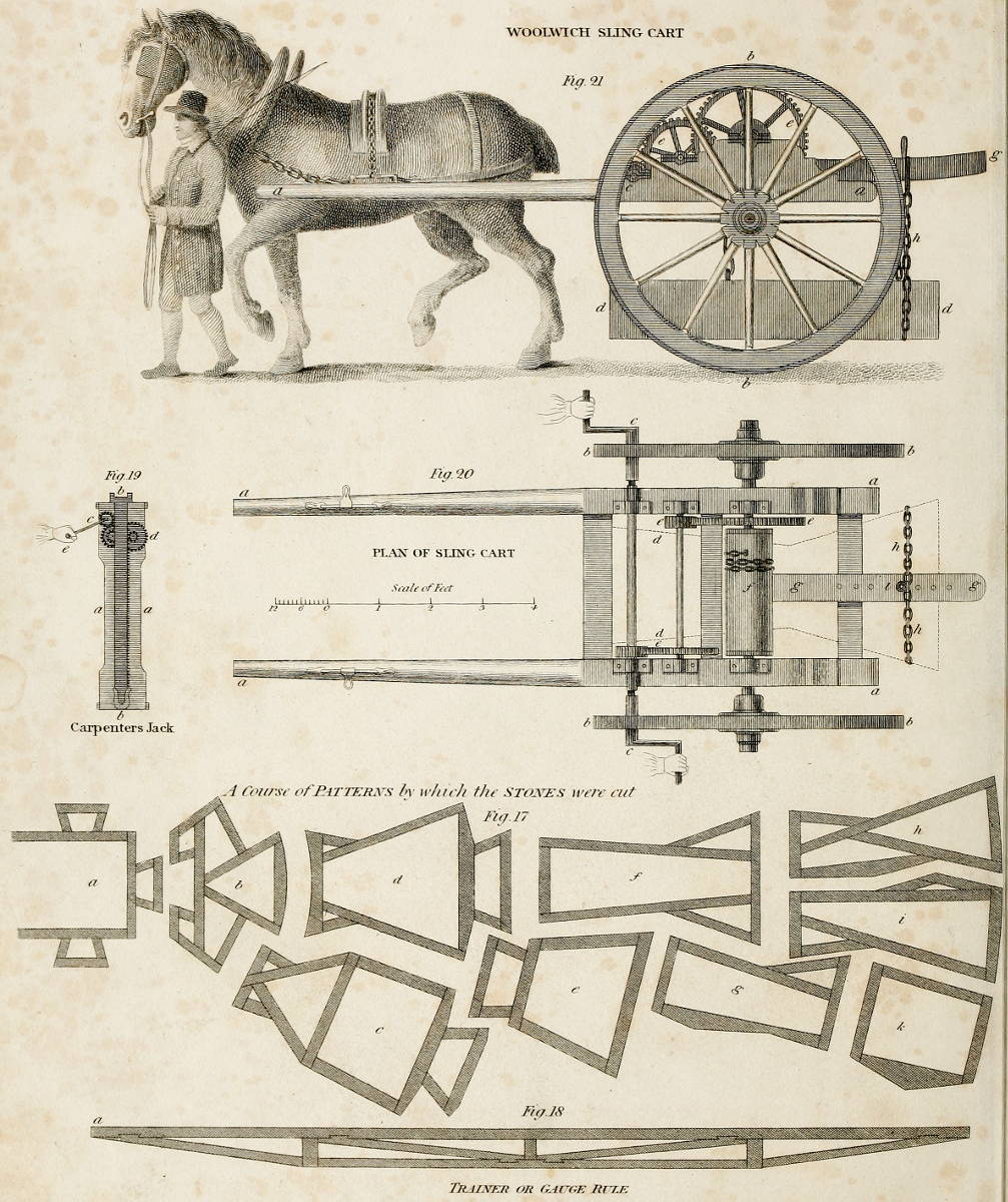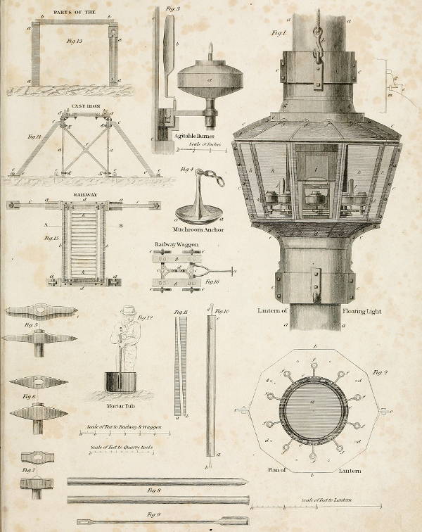 | Railways, Waggons, Sheer-crane, Moveable-beam-crane, Sling-cart, Carpenters’ Jack, Lewis-bat, Moulds, Coffer-dam, Pumps, Winch-machine. | 189–196 |