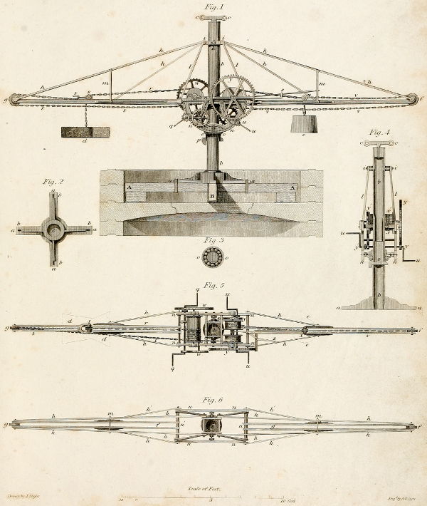 Fig. 6. is a plan of the frame work of this machine: b is the upright column, with the upper malleable iron-collar, shewing its connection with the king-posts l l of Fig. 1.; f and g are the extremities of the main-purchase and balance-beams; m´ m´ the horizontal rods connecting with the main-ties; h h, &c. the main ties; h´ h´, &c. the horizontal braces; n n n n the cheeks or frame of the wheels and machinery, with the two great bolts marked n´ n´, by which the frame was principally connected; these bolts being passed also through the interior ends of the balance and working beams.