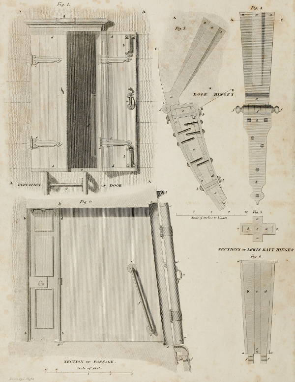 Fig. 1. represents part of the outward wall A A A A, and entrance-door, one leaf or half of which is open, and the other shut; a, one of the handles for opening and shutting it, connected with a thumb-latch; b b the bolts for securing the door when shut; c c c c the hinges; d d d d the brass guard-plates at top and bottom of the door, for defending the timber. The door is framed of fir-wood, and measures 6 feet 4 inches in height in the clear, besides the brass-checks upon which it shuts at top and bottom, which are of 2 inches in depth, as shewn at e in Fig. 1., and also by an end view in Fig. 2. The two leaves form a common breadth of 2 feet 10 inches[524] in the clear. A cornice of brass is formed on the lintel of the door answerable to an eaves-drop, in which a friction roller h is placed, for the chain of the crane, with which the stores are raised. The door, when shut, finishes flush with the building, and is therefore of a circular form, framed and double lined, the whole being put together with white-lead paint: each leaf measures 5 inches in thickness at the hinge side, and diminishes to 2½ inches at the meeting edges, as will be understood by examining the section in Fig 3. When the leaves of the door are thrown open, they are kept in their places by catch-hooks of brass, to prevent gusts of wind from shutting them suddenly; f shews a moveable handle or piece of brass rail, within the passage, for laying hold of in stepping off the brazen ladder to enter the house; g shews the upper extremity or highest step of the ladder, which terminates at the sill of the door.