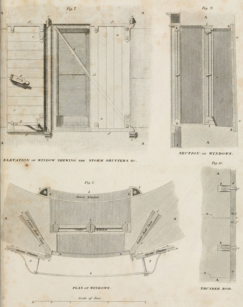 Fig. 9. is a perpendicular section of one of the windows, shewing the triple mode of shutting them during stormy weather. A A a section of a part of the walls. a a, the storm-shutter; h h the check in the building for its reception; i i the frame of the outer-window; k k the inner-window; l the case into which the inner-window drops when not in use.