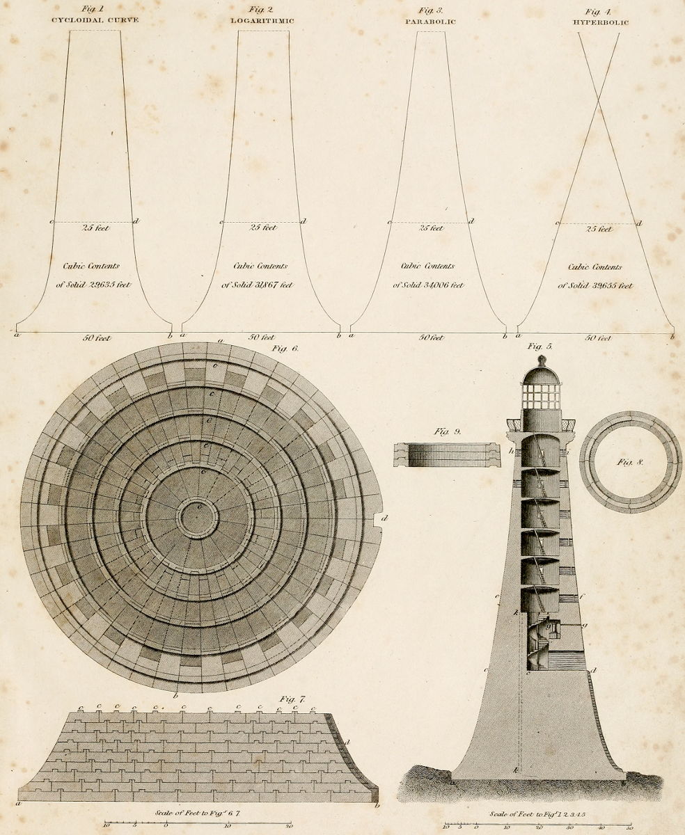 With the construction and dimensions, therefore, of the Light-houses above alluded to in view, the design delineated in this Plate is given, as the result of the writer’s knowledge and experience on subjects of this kind. Without, however, entering into particulars as to the mode in which such an operation should be conducted, he merely notices, in reference to the various curves delineated in Figs. 1, 2, 3, and 4. as applicable to Light-houses upon sunken rocks, that he prefers the curve of the diagram represented in Fig. 3., as the outline of a building for a situation like the Wolf Rock.