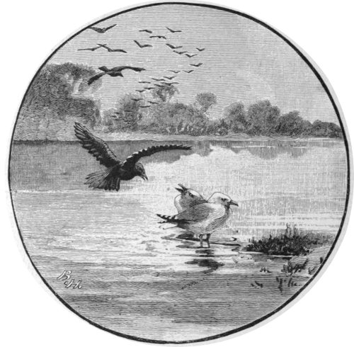 But more out-of-the-way birds will sometimes come to Oxford, and I have seen a Kestrel trying to hover in a high wind over Christchurch Meadow, and a Heron sitting on the old gatepost in the middle of the field. Herons are often to be seen by the river-bank in Port Meadow; and it was here, some years ago, that Mr. W. T. Arnold, of University College, was witness of an extraordinary attack made by a party of three on some small birds. Port Meadow constantly entices 33 sea-birds when it is under water, or when the water is receding and leaving that horrible slime which is so unpleasant to the nose of man; and in fact there is hardly a wader or a scratcher (to use Mr. Ruskin’s term)[10] that has not at one time or another been taken near Oxford. Sometimes they come on migration, sometimes they are driven by stress of weather. Two Stormy Petrels were caught at Bossom’s barge in the Port Meadow not long ago, and exhibited in Mr. Darbey the birdstuffer’s window. And a well-known Oxford physician has kindly given me an interesting account of his discovery of a Great Northern Diver, swimming disconsolately in a large hole in the ice near King’s Weir, one day during the famous Crimean winter of 1854-5; this splendid bird he shot with a gun borrowed from the inn at Godstow. During the spring and early summer of 1866, our visitors from the sea-coast were constant and numerous. Even the beautiful and graceful little Tern (Sterna Minuta) 34 more than once found his way here; and on the second occasion saved his own life by the confidence which he seemed to repose in man. ‘I intended to shoot it,’ wrote a young friend of mine, ‘but relented when I saw how tame and trustful it was.’