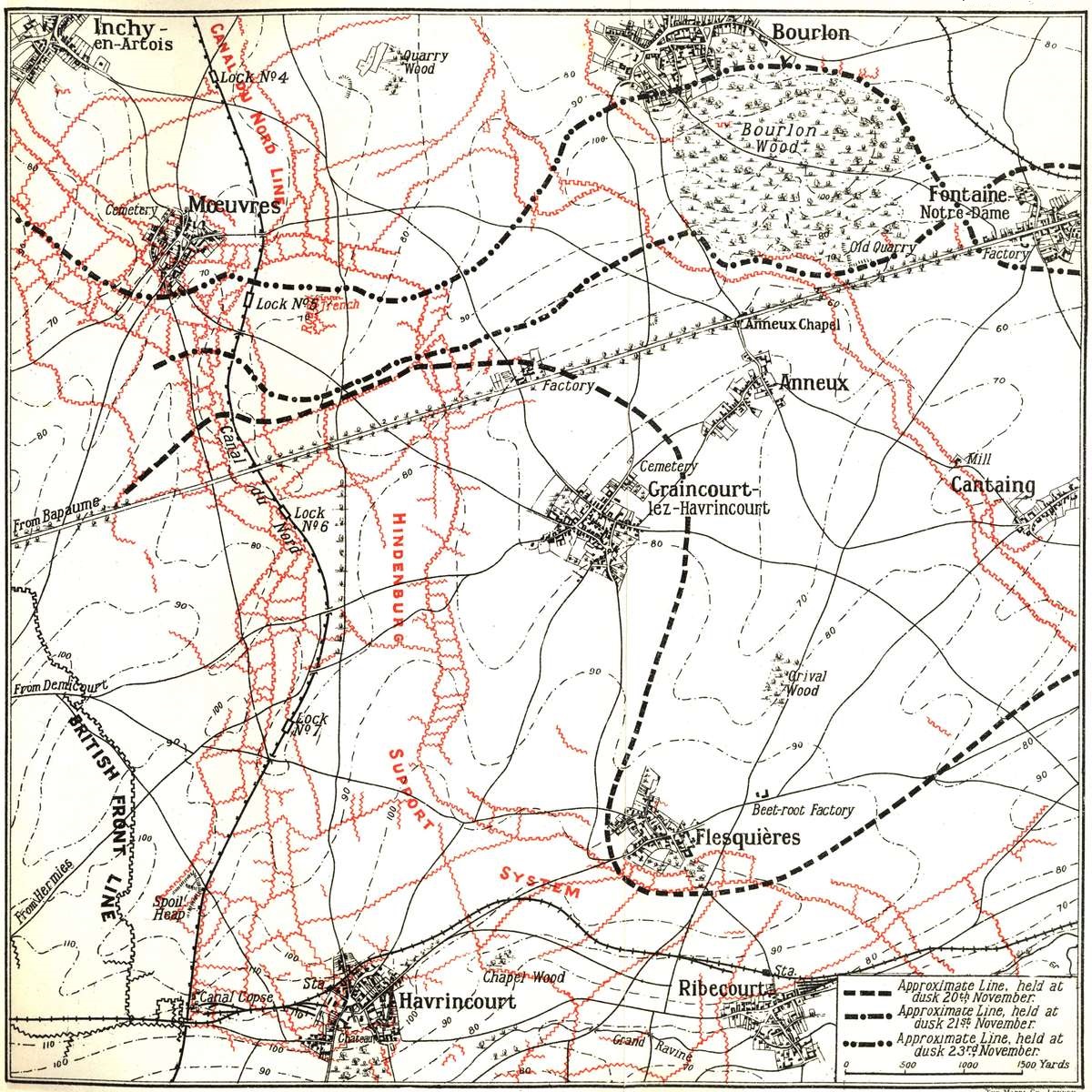 | Plans for Nov. 23rd—The Grapple at Bourlon—Relief of 36th Division—The German Counter-offensive—British Withdrawal—Defence of 9th Inniskillings—Attack of 11th Inniskillings—Relief in a Blizzard—Summary of the Battle. | ||