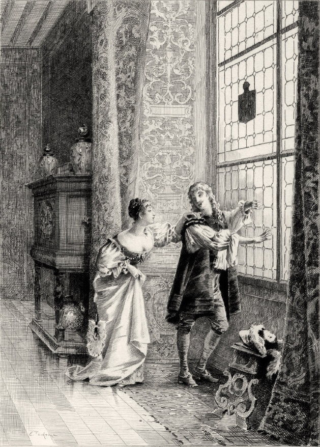 This morning I looked at him for a long while without his seeing me.—I was hidden behind my curtain.—He was at his window which is exactly opposite mine.—This part of the chateau was built toward the close of the reign of Henri IV.; it is half of brick, half of unhewn stone, according to the custom of the time; the window is long and narrow, with stone lintel and a stone balcony.—Théodore—for you have already guessed of course that he is the young man in question—was leaning in a melancholy attitude on the rail, and seemed to be deep in meditation.—Draperies of red damask with large flowers, half drawn aside, fell in broad folds behind him and served as a background.—How beautiful he was, and what a marvellous effect his dark, sallow face produced against the dark red! Two great bunches of hair, black and glossy, like the grape clusters of Erigone of old, fell gracefully along his cheeks and made a charming frame for the pure and delicate oval of his beautiful face. His round, plump neck was entirely bare and he wore a sort of dressing-gown with flowing sleeves not unlike a woman's robe. He held in his hand a yellow tulip, at which he plucked pitilessly in his reverie, throwing the pieces to the wind.