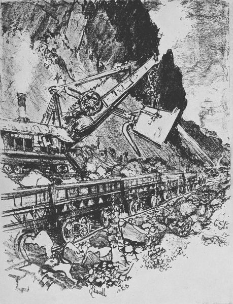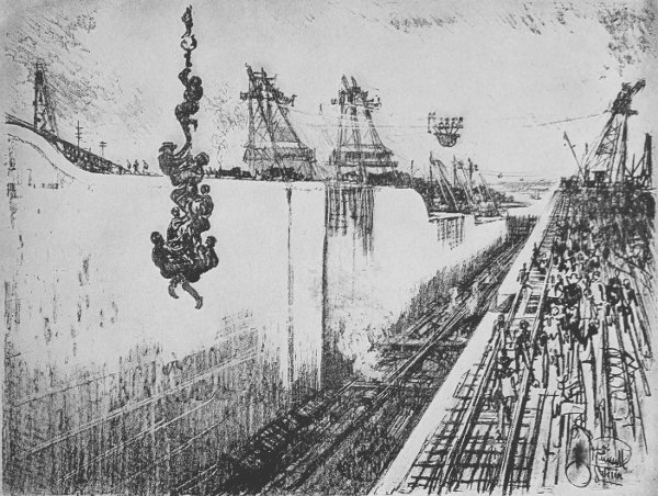 I did not bother myself about these things, nor about lengths and breadths and heights and depths. I went to see and draw the Canal, and during all the time I was there I was afforded every facility for seeing the construction of the Panama Canal, and from my point of view it is the most wonderful thing in the world; and I have tried to express this in my drawings at the moment before it was opened, for when it is opened, and the water turned in, half the amazing masses of masonry will be beneath the waters on one side and filled in with earth on the other, and the picturesqueness will have vanished. The Culebra Cut will be finer, and from great steamers passing through the gorge, worth going 15,000 miles, as I have done, to see. But I saw it at the right time, and have tried to show what I saw. And it is American—the work of my countrymen.