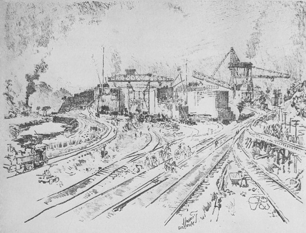 THIS was drawn from the opposite end of the lock and the great side walls topped with their concrete-making crenellations and cranes are seen. In the foreground, on the left, is one of the side openings for emptying the water from one lock to another—for all the locks are double, side by side, and ships will not have to wait until a lock is empty, as is usual, before they can enter, but, as one empties, the same water partly fills the one beside it, and so steamers will pass without waiting. Two or three small vessels can go through at the same time, as well as the largest with room to spare.