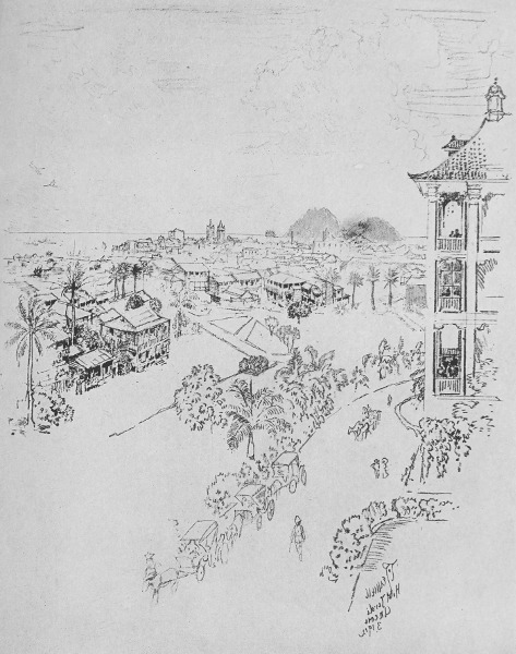 THIS drawing was made from the channel which leads out to the Pacific Ocean. The mouth of the Canal is on the left in the flat space between the mountains; on the right of this, the dark mass on the edge of the water is the docks and harbors; then comes the great, towering Ancon Hill, one side all dug out in terraces for dirt, much of which goes to fill in the outside of locks, which, however, will work before they are filled in. And for what other purposes the War Department are going to use this Gibraltar they alone know. The other side, a mass of palms shelters the houses of the officials, and at the foot of the hill, to the right, Panama—as beautiful as Naples or Tangier, yet hardly a tourist knows it; and—well, the Government is not running a tourist agency.