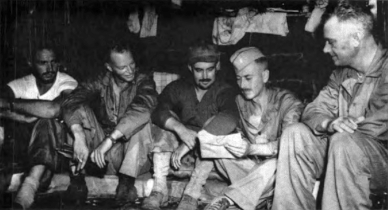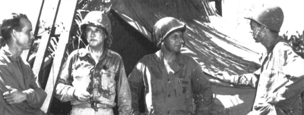 LtCol William J. Scheyer, third from the left, was the 9th Defense Battalion commander. He is shown at his New Georgia command post with Col John W. Thomason, Jr., second from the left, from Admiral Nimitz’ CinCPac headquarters at Pearl Harbor, and Maj Zedford W. Burriss of the 10th Defense Battalion on the left.