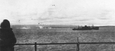 Allied landings were met by ground and air defense, as seen in this photograph taken from the USS Algorab (AKA 8) on D-Day, 30 June 1943. Japanese were bombing Rendova Harbor in the background while the transport group moves to sea under “Condition Red.” During this raid the flagship USS McCawley (AP 10) was hit, but Allied air cover kept most of the enemy aircraft away.