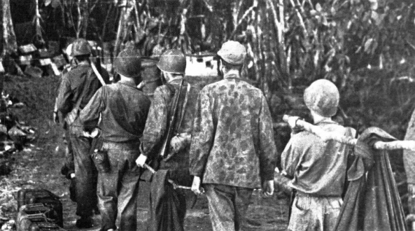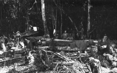 Soldiers and Marines consolidate their positions and construct barbed wire obstacles on the Dragons Peninsula after the attack on Bairoko. Their apparent condition, mixture of clothing, and the ever-present jungle provide eloquent testimony to the physical demands of the campaign.