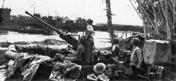 A 40mm gun and crew look skyward for Japanese aircraft as the XIV Corps landing continues. Landing Craft Infantry (LCIs) are run up on the beach in the background, as working parties unload them by hand.