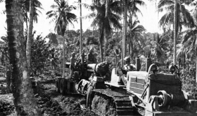 A 155mm Long Tom is dragged through the mud of Rendova en route to a new position from which it could punish Japanese positions and at the same time defend against Japanese counterattacks.