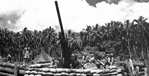 Behind a revetment of sandbags and coconut logs, this 9th Defense Battalion crew manning a 90mm antiaircraft gun keeps vigilant watch against Japanese air attacks on positions at the beach at Rendova.