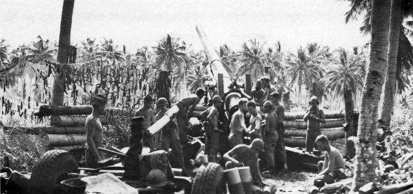 Capt Henry H. Reichner’s Battery A loads its Long Toms on an LCT to move to Piru Plantation from Tambusolo Island. These moves were staggered to provide continuous artillery support during this phase and were carried out with speed and efficiency.