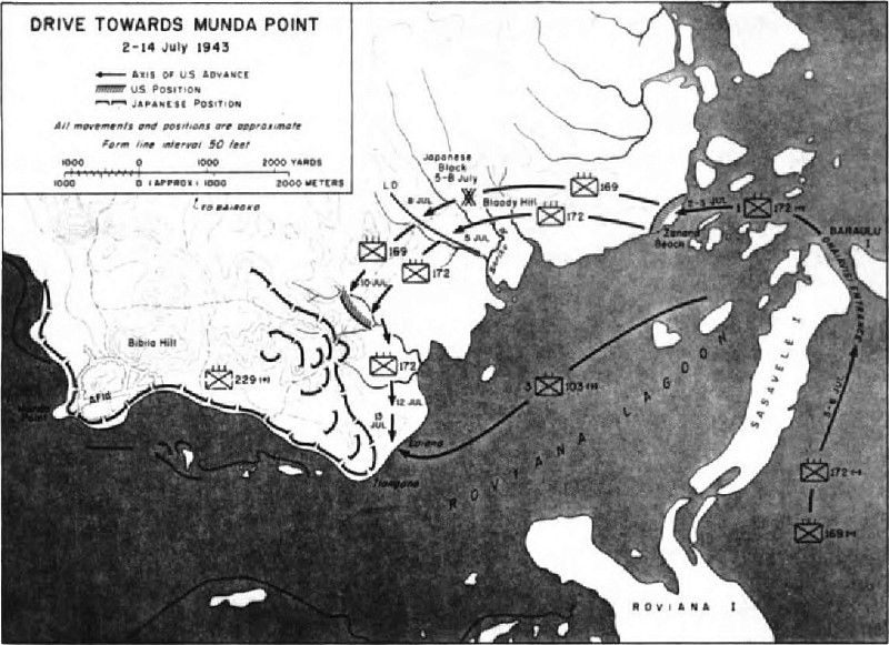 At this same time, XIV Corps began its Munda drive by moving from Rendova to New Georgia, supported by the Army 136th Field Artillery Battalion and the 9th Defense Battalion. Zanana Beach had been selected for the 43d Infantry Division’s landing. The division order stated that the 43d, less the 103d Regimental Combat Team, would “land on New Georgia Island, capture or destroy all enemy encountered, and secure the Munda Airfield.” On 3 July, the 172d Infantry moved by landing craft to New Georgia, followed the next day by the 169th Infantry. The Munda drive had begun.