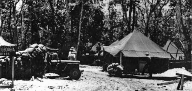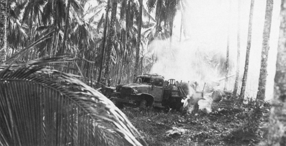 In many cases, 9th Defense Battalion equipment had to be dismantled and carried to assigned areas. The 9th’s motor transport section performed as best it could with the resources available and until the majority of its vehicles burned out from the strain of operating in the Rendova muck. Their task was made easier by the amphibious tractors, which were the only sure means of transportation and these had troubles of their own as they threw off their tracks on uneven terrain. “Frances,” “Tootsie,” and “Gladys” were three amphibious tractors in the beach area manned by nine 3d Division Marines who operated continuously keeping supplies moving from position to position. All tractors were damaged eventually in the Japanese air attacks that followed.