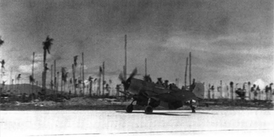 The Vought F4U Corsair, such as these on the Russell Islands, provided much of the air support in the New Georgia campaign. Here they taxi out from revetments onto the air strip to meet Japanese planes coming down The Slot from Bougainville and Rabaul.