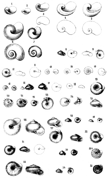 Die Mollusken des süssen Wassers sind so ziemlich überall verbreitet; es dürfte kaum ein Bach zu finden sein, in dem nicht[S. 14] Schnecken oder Muscheln vorkämen, selbst in warmen Quellen finden sich hier und da Schnecken, z. B. Bithynia thermalis in den Bädern von Lucca, Hydrobia aponensis in den Quellen von Abano. Im Allgemeinen sind schnellfliessende, kalte Gebirgsbäche mit steinigem Grund viel ärmer, als langsam fliessende oder gar die reich mit Pflanzen bewachsenen stehenden Gewässer der Ebene. Während jene nur einige Unionen und 2–3 Limnäen und Ancylus enthalten, liefern uns die Gewässer der norddeutschen Ebene 78 Arten; manche Gattungen, z. B. Physa und Paludina, und die grossen Planorben, scheinen sich, wenigstens in unserem Gebiete, nie in’s Gebirge zu versteigen, während Hydrobia nur dem gebirgigen Theile desselben angehört.