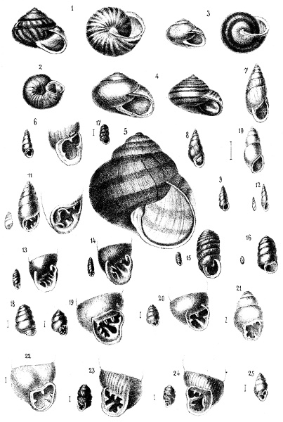 Man unterscheidet zunächst das einschalige Schneckenhaus, Testa, von der zweischaligen Muschel, Concha. An dem Schneckenhaus haben wir die Spitze, die verschiedenen Windungen oder Umgänge, und die untere Oeffnung oder Mündung. Die feine Haut, welche die Aussenfläche des Gehäuses überkleidet[S. 25] und hauptsächlich die Farben enthält, nennt man die Oberhaut, Epidermis. Die Linie, in welcher die einzelnen Windungen zusammenstossen, nennt man die Naht, Sutura; die gerade Linie dagegen, um welche die Windungen herum gewunden sind, bezeichnet man als Spindel, Columella. An der Unterseite des Gehäuses sehen wir oft ein Loch, dadurch entstanden, dass die verschiedenen Windungen sich hier nicht berühren, die Spindel also gewissermassen einen hohlen Kegel bildet, in den man hineinsehen kann; man nennt dieses Loch den Nabel, Umbilicus, und unterscheidet, da seine Beschaffenheit für die Bestimmung sehr wichtig ist, verschiedene Abstufungen in der Weite desselben; man nennt ein Gehäuse genabelt, wenn die Oeffnung ziemlich weit ist, wie bei Helix obvoluta, durchbohrt, wenn sie eng ist, wie bei Helix sericea, geritzt, wenn sie nur in einem mehr oder weniger vertieften Ritz besteht, wie bei den Clausilien. Wird der Nabel von dem der Spindel zunächst liegenden Theile des Mündungsrandes ganz oder zum Theil überdeckt, so nennt man das Gehäuse bedeckt — genabelt, oder — durchbohrt. Der Nabel kann ausserdem noch ganz- oder halbdurchgängig, weit, perspectivisch u. dergl. sein.