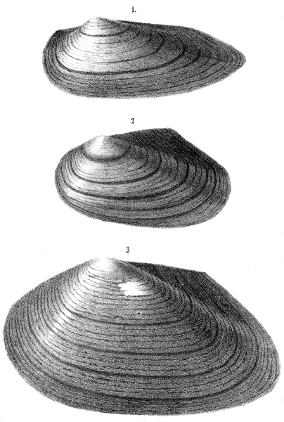 Auf jeder Schale sehen wir einen vorgetriebenen Punkt, den Wirbel oder Buckel; die beiden Wirbel liegen immer einander genau gegenüber und nahe am Oberrand. Theilt eine durch sie hindurch gehende Linie die Muschel in zwei ganz oder doch annähernd[S. 27] gleiche Theile, so nennt man dieselbe gleichseitig, im anderen Falle, der bei unseren meisten Muscheln vorkommt, ungleichseitig. Den Raum unmittelbar vor und zwischen den Wirbeln nennt man das Schildchen (Areola, Lunula), den hinter den Wirbeln bis zum Anfange des Hinterrandes den Schild (Area). In diesem Raume liegt ein starkes, zähes Band, das die beiden Schalen verbindet und durch seine Elasticität ihr Aufklappen bewirkt, das Schlossband. Der unmittelbar unter demselben liegende Theil des Oberrandes ist meist mit ineinandergreifenden Zähnen oder Leisten versehen, die beim Oeffnen der Schalen ein Auseinanderweichen verhindern; man nennt die ganze Vorrichtung das Schloss.
