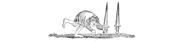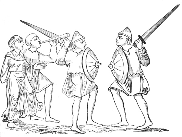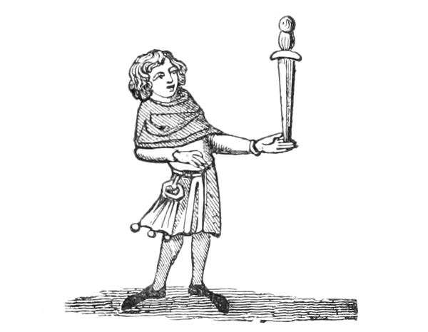 The sportive exercises and pastimes practised by the Saxons appear to have been such as were common among the ancient northern nations; and most of them consisted of robust exercises. In an old Chronicle of Norway, [1] we find it recorded of Olaf Tryggeson, a king of that country, that he was stronger and more nimble than any man in his dominions. He could climb up the rock Smalserhorn, and fix his shield upon the top of it; he could walk round the outside of a boat upon the oars, while the men were rowing; he could play with three darts, alternately throwing them in the air, and always kept two of them up, while he held the third in one of his hands; he was ambidexter, and could cast two darts at once; he excelled all the men of his time in shooting with the bow; and he had no equal in swimming. In one achievement this monarch was outdone by the Anglo-Saxon ᵹlıᵹman, represented by the engraving No. 50, [2] who adds an equal number of balls to those knives or daggers. The Norman minstrel Tallefer, before the commencement of the battle at Hastings, cast his lance into the air three times, and caught it by the head in such a surprising manner, that the English thought it was done by the power of enchantment. Another northern hero, whose name was Kolson, boasts of nine accomplishments in which he was well skilled: "I know," says he, "how to play at chess; I can engrave Runic letters; I am expert at my book; I know how to handle [Pg xx] the tools of the smith; [3] I can traverse the snow on skates of wood; I excel in shooting with the bow; I use the oar with facility; I can sing to the harp; and I compose verses." [4] The reader will, I doubt not, anticipate me in my observation, that the acquirements of Kolson indicate a much more liberal education than those of the Norwegian monarch: it must, however, be observed, that Kolson lived in an age posterior to him; and also, that he made a pilgrimage to the Holy Land, which may probably account in great measure for his literary qualifications. Yet, we are well assured that learning did not form any prominent feature in the education of a young nobleman during the Saxon government: it is notorious, that Alfred the Great was twelve years of age before he learned to read; and that he owed his knowledge of letters to accident, rather than to the intention of his tutors. A book adorned with paintings in the hands of his mother, attracted his notice, and he expressed his desire to have it: she promised to comply with his request on condition that he learned to read it, which it seems he did; and this trifling incident laid the groundwork of his future scholarship. [5]
