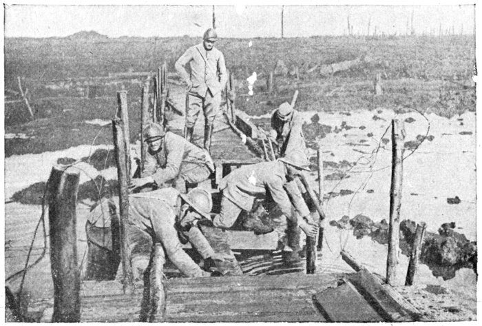 Keeping up their daily bombardment, the enemy now directed their main effort between Nieuport and Dixmude. However, they were held by the inundations which soon spread southwards. Moreover, the ceaseless rain had transformed the ground into a veritable sea of mud, which gradually invaded the trenches. Shivering with cold and fever, and up to their knees in slime, the Marines still stood firm.