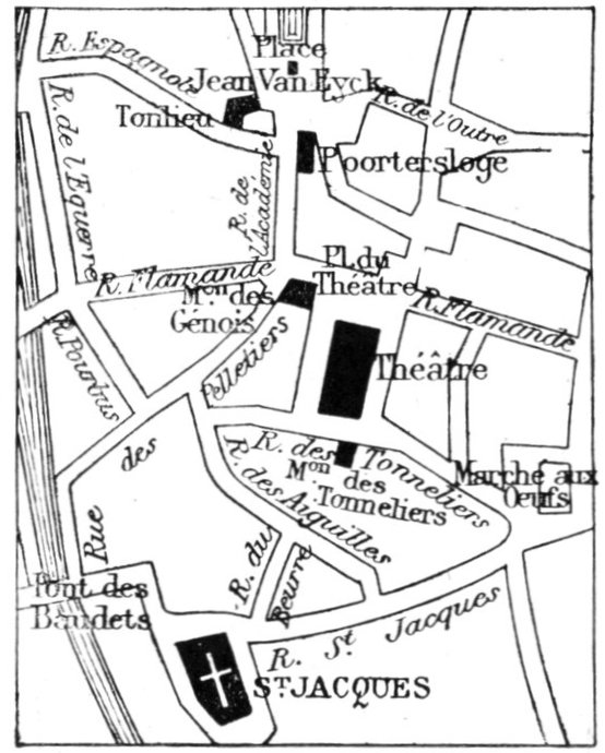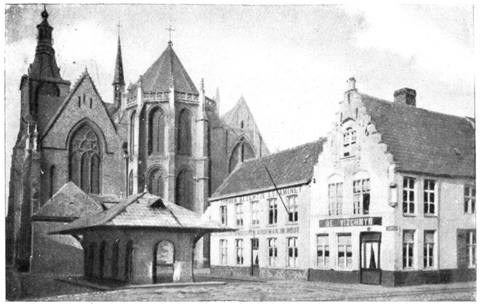 Keeping straight ahead beyond the Grand'Place, in which stands the Renaissance Hôtel-de-Ville, the tourist will notice, immediately on the left, an Old Gate (Westpoort), a vestige of the ancient fortifications. A sycamore tree, probably some four or five centuries old, near by, is said by the inhabitants to have been used by Julius Cæsar as a picket for tethering his horse.