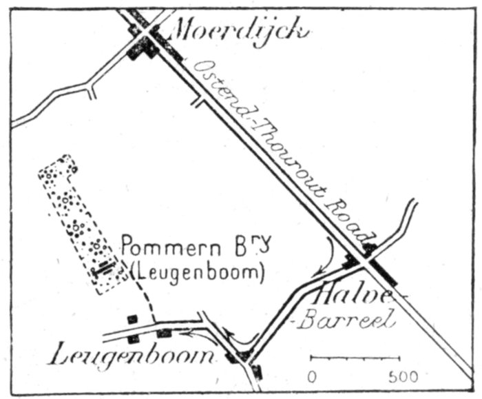 Beyond the church is a crossing; the road on the right leads to Ramscappelle (4½ kms.) which played an important part in 1914. On October 30, 1914,[Pg 118] a fierce German thrust ended in the capture of the village—already on the point of being inundated—from the Belgian 5th and 6th Infantry Regiments. The loss was one of the greatest importance, as no lines of resistance had been prepared in the rear. The recapture of Ramscappelle was therefore an indispensable if very difficult operation. (See p. 15.)