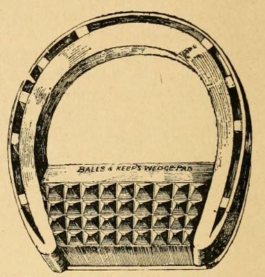 One of the simplest anti-slipping pads is "Balls & Keep's Wedge-pad." It possesses one advantage in not covering up the whole under-surface of the foot. When properly fitted it is firmly retained and does its work, but a careless farrier may so apply it that it shifts on the foot. To fit it exactly[Pg 110] the wall of the back part of the foot must be lowered more than that in front, so that shoe, foot and pad may all be closely adjusted.