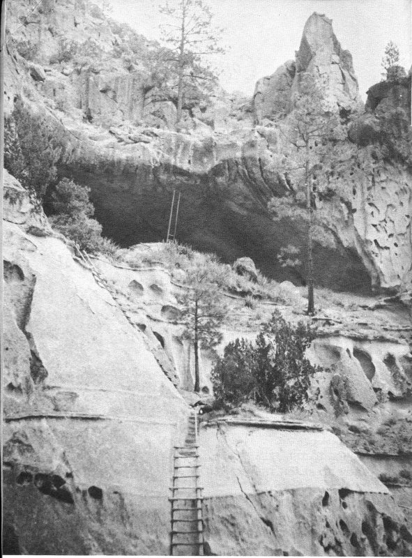 In the picturesque canyon and mesa country of the Pajarito Plateau, west of the Rio Grande from Santa Fe, N. Mex., are found the ruined dwellings of one of the most extensive prehistoric Indian populations of the Southwest. Bandelier National Monument, in the heart of the plateau, includes and protects several of the largest of these ruins, in particular the unique cave and cliff dwellings in the canyon of the Rito de los Frijoles.