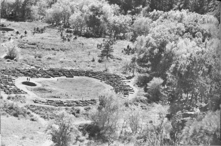 To conclude this general summation of ruin types, some description should be made of kivas. Kivas were, and are, the ceremonial chambers of the Pueblo people; as such, they are universally present in the Pajarito communities and their design makes them identifiable even in the ruined state. The local kivas were always round and were dug almost full-depth into the ground, except for certain examples which were excavated into the relatively soft bedrock of cliff or mesa-top. The circular depressions still to be found in the plazas of the great communal houses are the remains of kivas with their roofs collapsed and with the wind-borne debris of centuries accumulated in the hollows. A more complete discussion of kivas and their functions will be found on page 12.