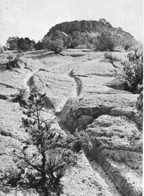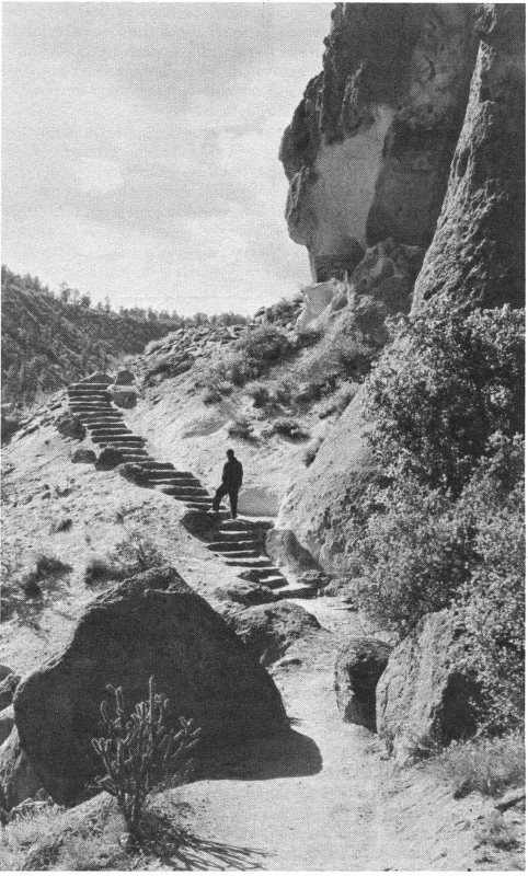 The most memorable sight at Tsankawi lies along the trail that climbs from the end of the access road to the mesa-top. Here for 100 yards the path, crossing a bald slope of soft gray tuff, is worn down for almost 18 inches by the climbing and descending feet of thousands of Indian passersby. Granted that the rock is extremely porous and soft, it is nonetheless almost beyond the scope of imagination to conceive the vast traffic required to so entrench the path. Today, when you climb this trail, you cannot but visualize a procession of Indian farmers over several generations traveling to and from their fields, their sandaled feet scuffing each year a fractional inch deeper into the calendar of the rock.