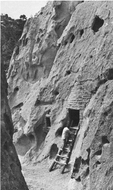 The rock which forms the walls of all the Pajarito canyons is a cemented volcanic ash called tuff, with many erosion cavities which can be readily enlarged with tools of hard stone. It might be logical to assume that early migrants to the Pajarito country, 700 years ago, first took shelter in the natural cavities, then presently improved these crude holes into more livable chambers. There is, however, no evidence to support the idea that the cave rooms were lived in first. In fact, some authorities reason that since the firstcomers had been living in masonry dwellings in their earlier homes, they would first have built the familiar communal buildings on arrival here, leaving the caves to be taken up later by overflow population.