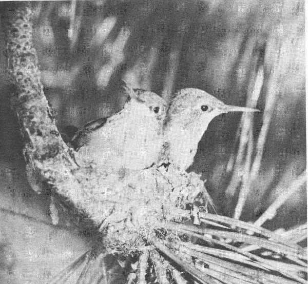 Two hummingbirds on a nest at the end of a pine twig. Several species of these birds are common at Bandelier.