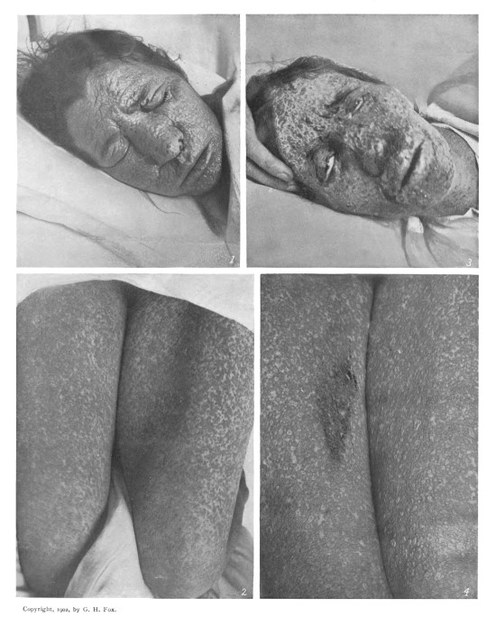 A severe case, showing the characteristic aggregation of lesions on the face and extremities. [P.]