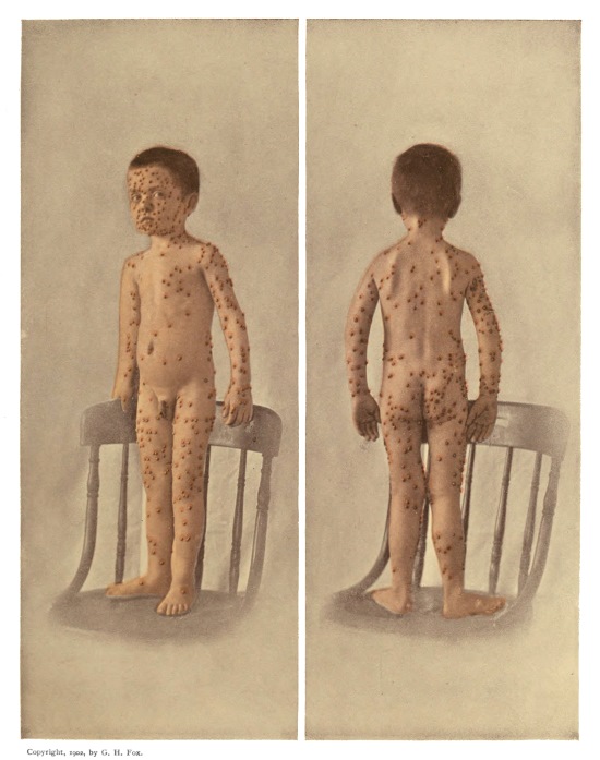 The effect of light upon the development of the smallpox eruption is a subject of considerable interest, and in recent years it has become one of therapeutic importance. As long ago as the fourteenth century John of Gaddesden and other physicians of his time were in the habit of excluding both light and fresh air from smallpox patients. The walls and furniture of the sick-room were painted red, on account of a peculiar virtue supposed to reside in this color, and the unfortunate occupant was nearly smothered by red curtains hung around his bed. Ever since that time it has been a common custom to darken the room of a smallpox patient, partly on account of the photophobia present during the course of the disease and partly on account of the idea that sunlight would aggravate the eruption. The fact that the face and hands are most intensely affected would seem to substantiate this idea, but the argument fails when we consider that the feet are usually the seat of an eruption scarcely less profuse.