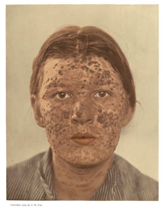 Showing numerous incipient papules upon the face. Those upon the forehead were the first to appear and are most prominent. The cheeks present a characteristic leathery appearance. [H.]