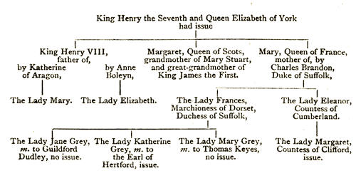 Note.—The following brief account of Henry VIII’s Will may aid the reader in understanding the complications to which it gave rise. By this famous testament (dated 26th of December 1546 and revoking all his previous Wills), King Henry VIII provided that, in case he himself had no other children by his “beloved wife Katherine [Parr] or any other wives he might have thereafter,” and in the event of his only son, Edward [afterwards King Edward VI], who was to be his immediate successor, dying childless, that prince was to be succeeded by his eldest sister, Princess Mary; and if she, in turn, proved without offspring, she was to be succeeded by her sister, King Henry’s younger daughter, Elizabeth. Failing heirs to that princess, the Crown was to pass to the Lady Jane Grey and her sisters, Katherine and Mary Grey, successively, these being the daughters of Henry’s eldest niece, the Lady Frances Brandon, Marchioness of Dorset. In the event of the three sisters Grey dying without issue,[xvii] the Throne was to be occupied successively by the children of the Lady Frances’s sister, the King’s other niece, the Lady Eleanor Brandon, Countess of Cumberland. The Scotch succession, through Henry’s eldest sister, Margaret Tudor, Dowager Queen of Scotland, was set aside, and the name of the young Queen of Scots [Mary Stuart] omitted from the Will, preference being given to the Ladies Grey, the daughters of Henry’s niece, because he hoped that the betrothal of Mary Stuart, then only six years of age, to his son Edward, might be arranged, and the desired union of England and Scotland brought about in a natural manner. It is curious that Henry’s nieces, the Ladies Frances and Eleanor, are not named in the Will as possible successors to the Crown, although their children are. Probably the King thought that, considering the number of claimants in the field, both ladies would be dead, in the course of nature, long before they could be called upon to occupy the Throne.